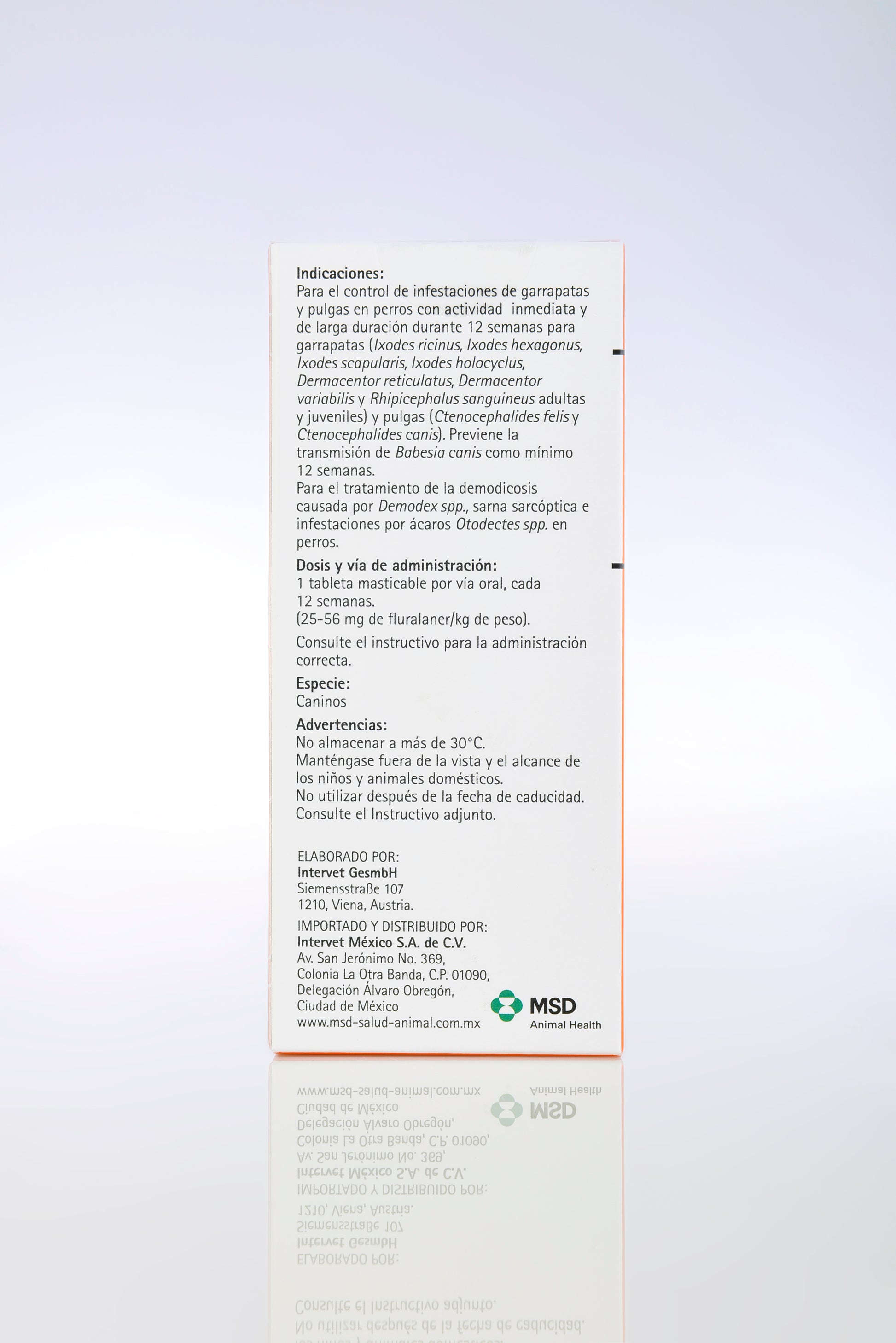 Para el tratamiento de infestación por garrapatas pulgas y ácaros de la sarna demodécica en los perros proporcionando 12 semanas de protección.