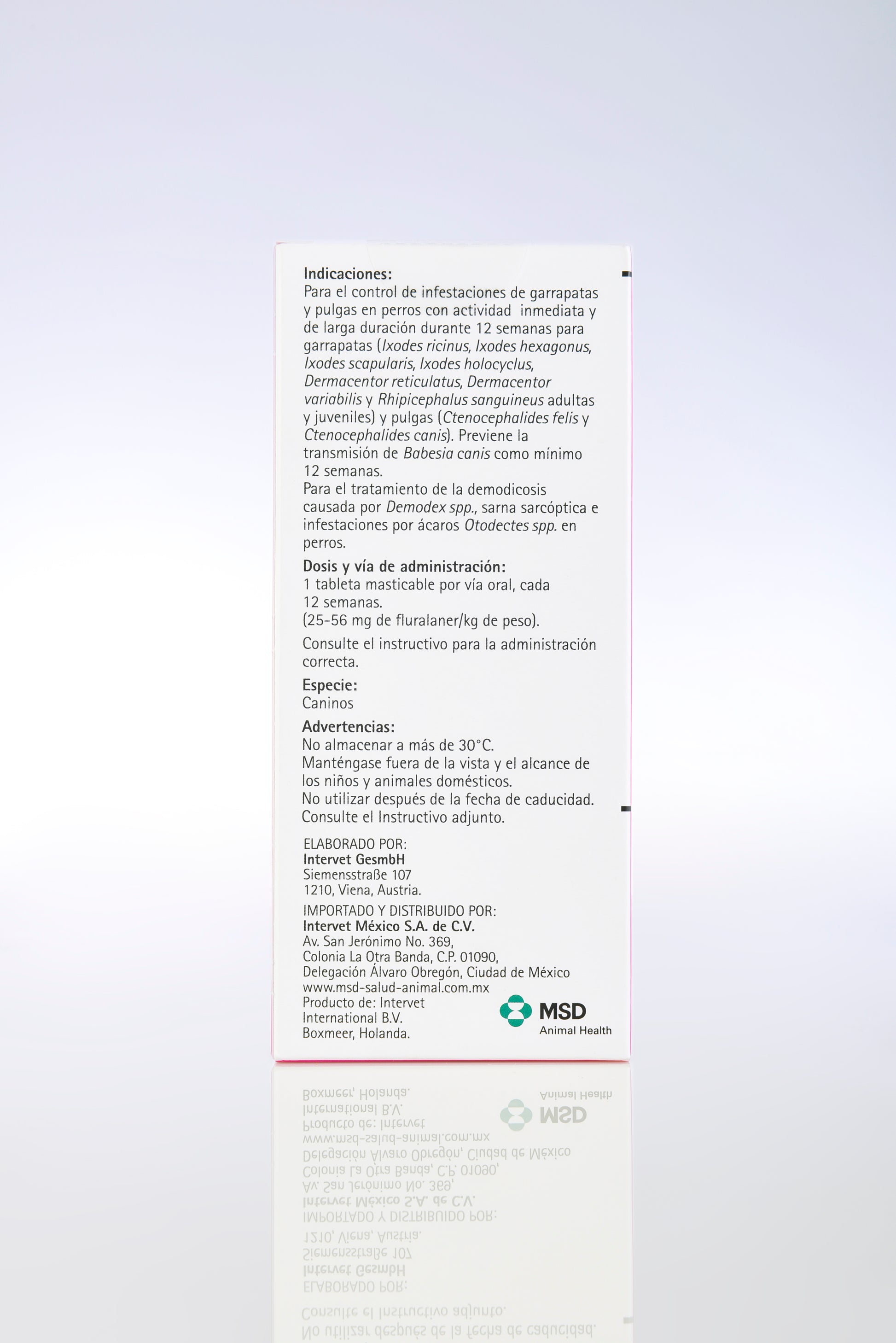 Para el tratamiento de infestación por garrapatas pulgas y ácaros de la sarna demodécica en los perros proporcionando 12 semanas de protección.