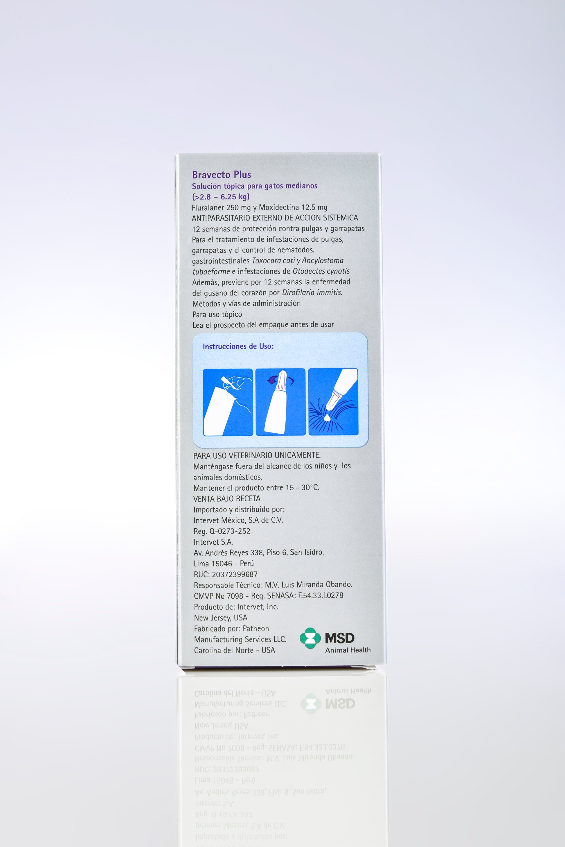 Solución tópica BRAVECTO PLUS para gato, se debe aplicar una sola dosis en la piel de la parte posterior del cuello (separar el pelo) con el fácil aplicador Twist’n’Use™ una vez cada 12 semanas.